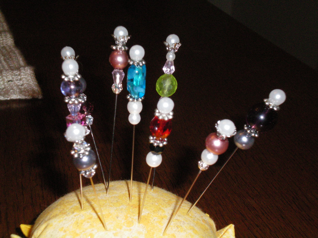 The second project was a selection of stick pins for a swap that I am in with an online friend. I need more bead caps and spacers. I have loads of beads but am always running out of those two findings. I finally found the really long pins at Jo-Anns in there wedding section.